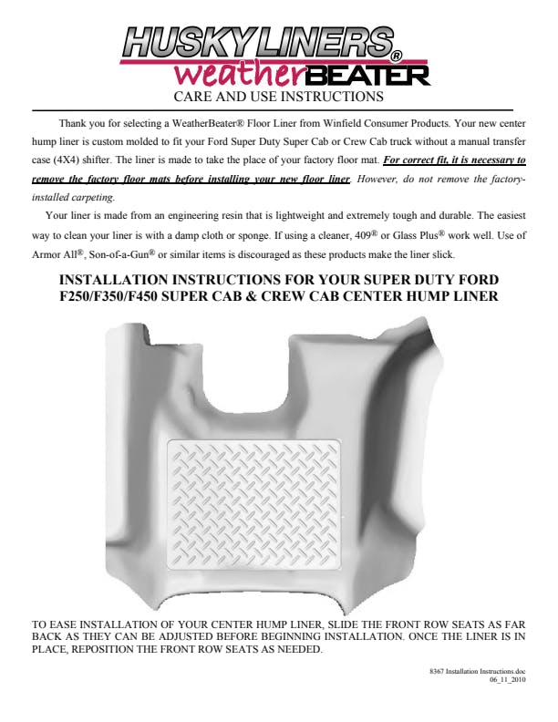 No hassle lifetime guarantee. For details: HuskyLiners.com/ForLife, When we say it's "guaranteed for life" that is exactly what we mean. No hassles, no guff. If you have a problem with this or any Husky product, we'll replace it., Over vinyl or carpet, our StayPut™ Cleats firmly lock to your factory anchors. It's rock-steady stability underfoot, only by Husky., Made in the USA., For applicable trucks, WeatherBeater™ Liners offer protection that extends all the way to your rear seats. So go ahead, lift the seats and leave them up, load after load. Husky's got your floors, and your back, no matter what the road brings your way., Made in the USA., Proudly made in the USA., Easy to install, remove, and clean. Just yank it out, hose it down and carry on., Protection prevents stains & soiling of your carpeted areas., Our sporty liner material is rugged and can stand up to abuse like no other. |