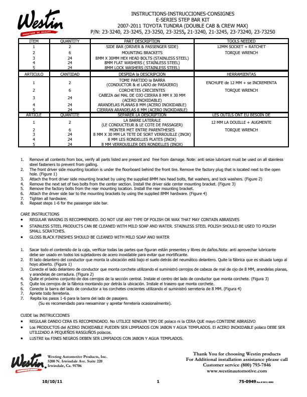 Westin(TM) E-Series Nerf Bars are made of 3in. diameter round tubing and are vehicle specific designs. Step design and mounting technique varies by application (mounting kit included). They feature recessed area mounted step pads unique to E-Series Nerf Bars feature the Westin(TM) brand name and are UV resistant.